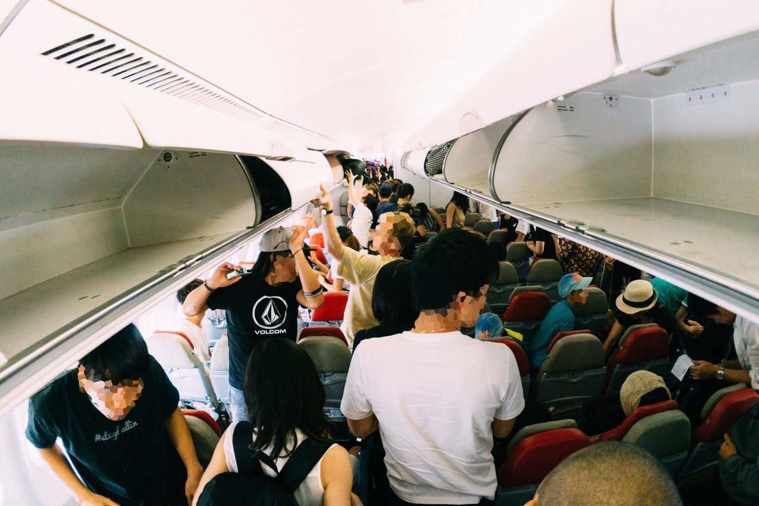 13時45分。無事に着陸してシートベルト着用サインが消えると一斉に動き出す人々。