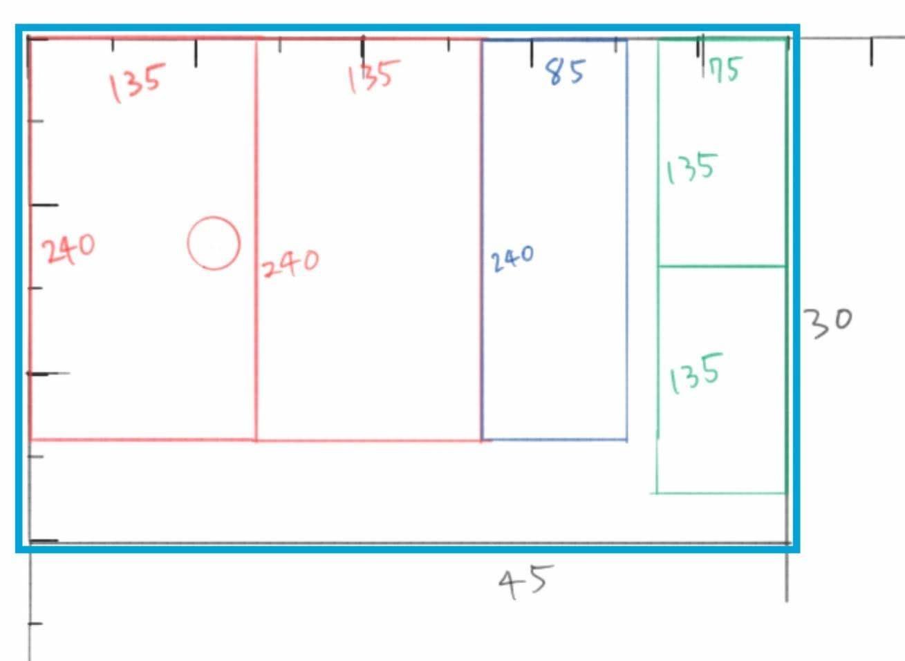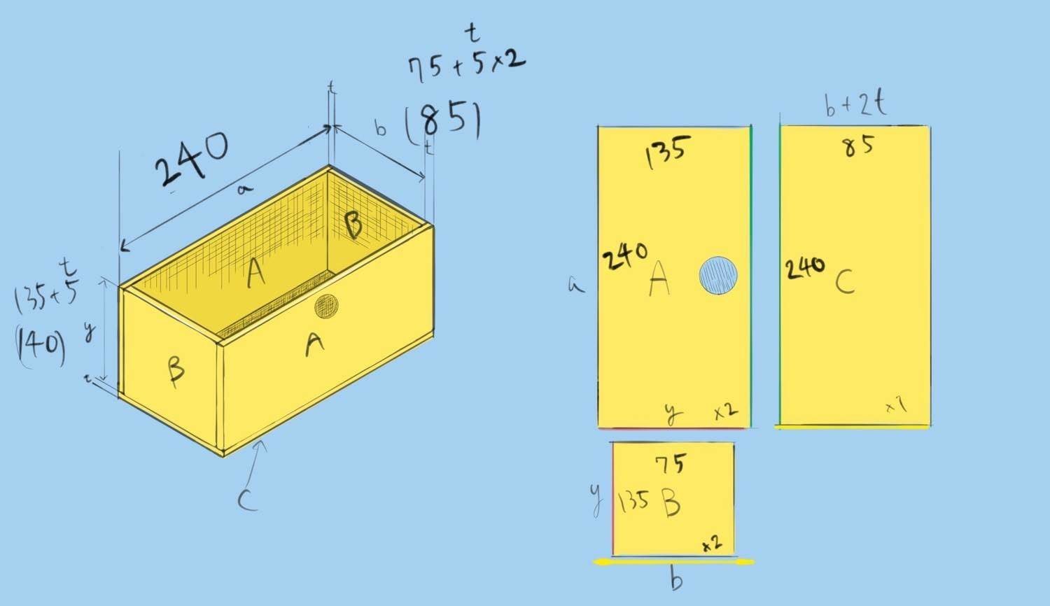 完成図とサイズメモがこちら。縮尺も適当なので設計と大げさに言うほどのものではないかもしれないですけれど。実際に配置する場所に合うサイズを定規で測って、板の5mmの厚みを考慮して必要な部品のサイズを算出しました。