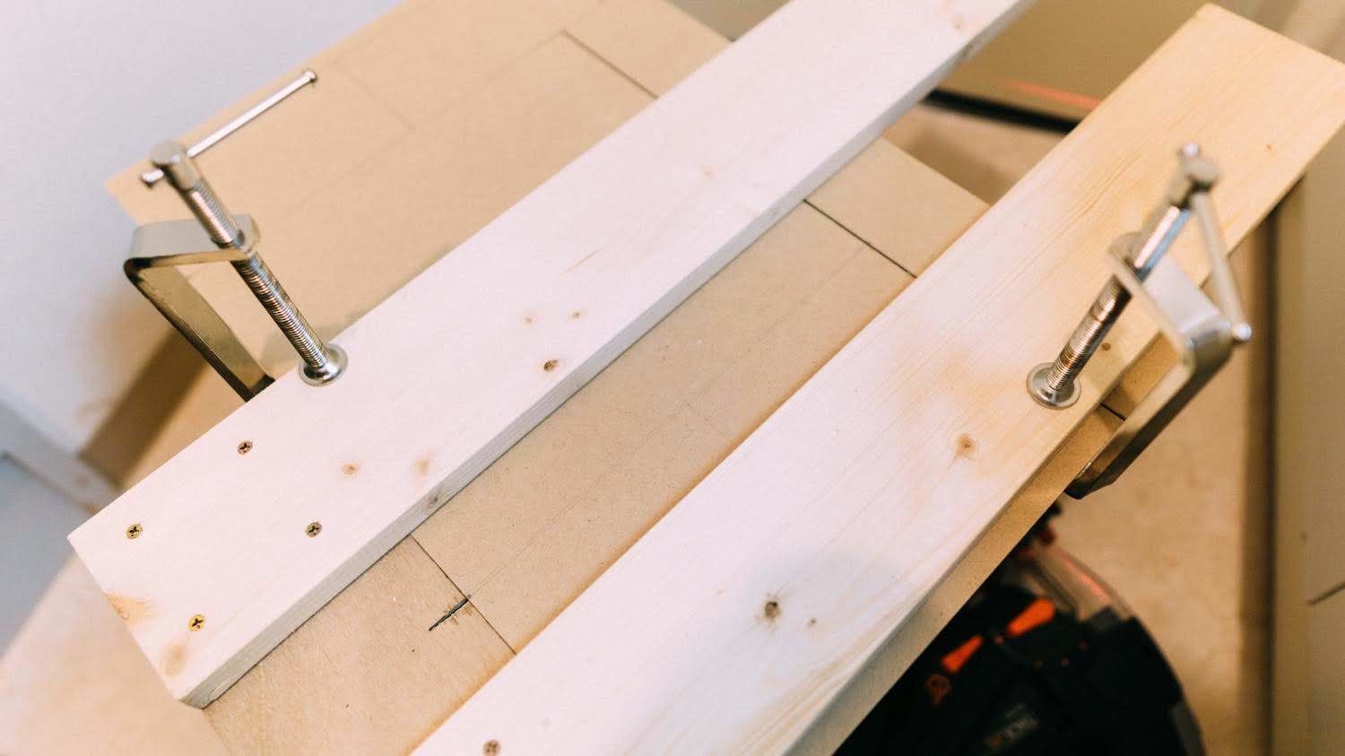 目印となる治具の切れ込みと、カットする線を合わせてクランプで固定します。