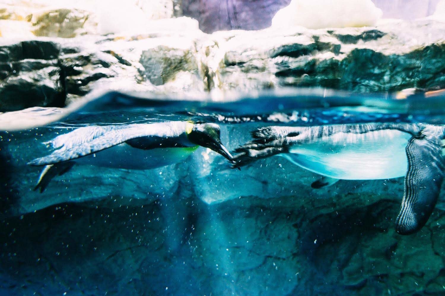 ちなみに人と撮ると明暗差と動きの早いペンギンのせいでだいぶイマイチに仕上がります。水族館での記念撮影ってそんなものだよね。人が写ってガラスが反射するか、人が真っ暗で魚が写るか。