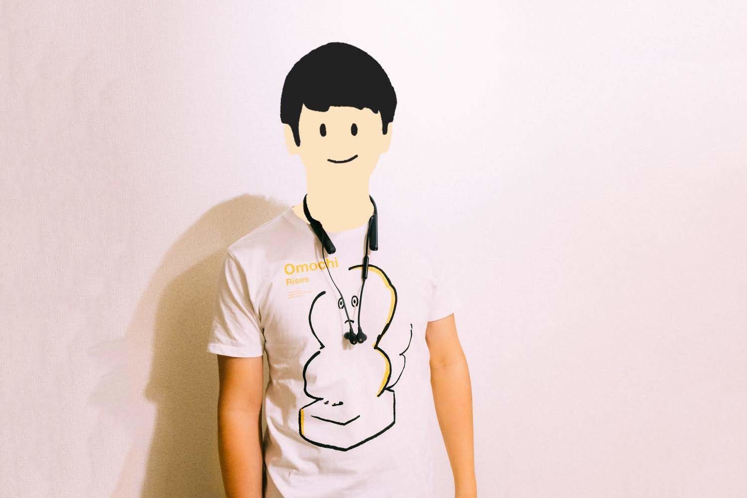耳から外すとこの状態。(イヤホンより目立っているのはお気に入りの「おもちTシャツ!」Omochi Rises.)